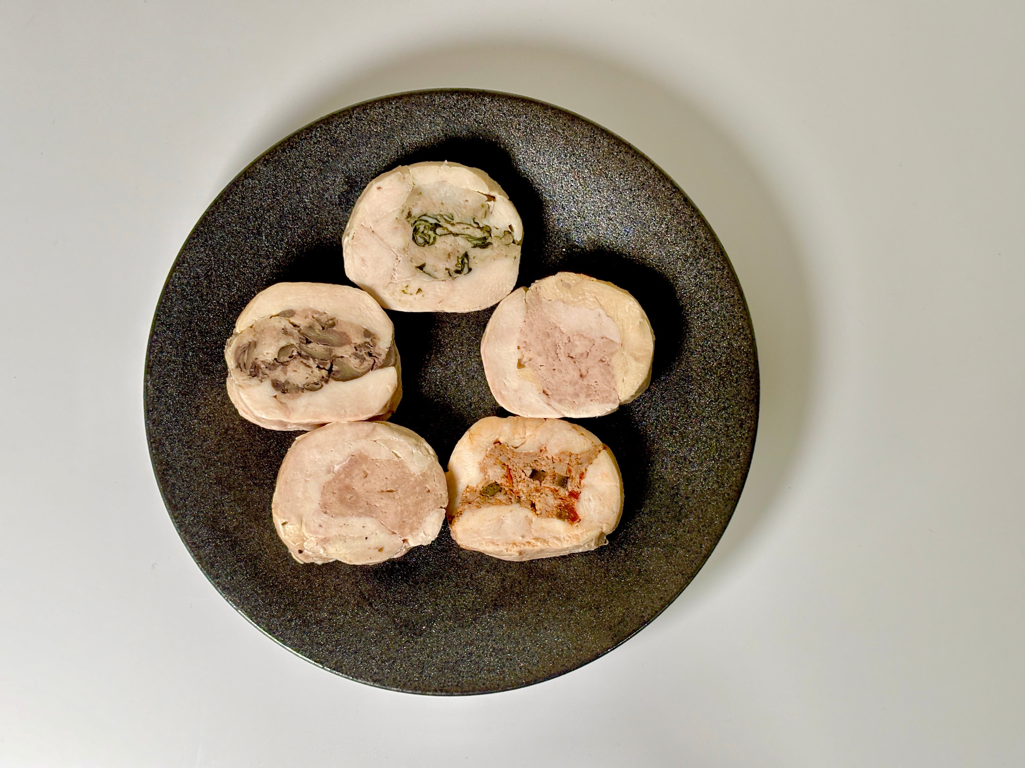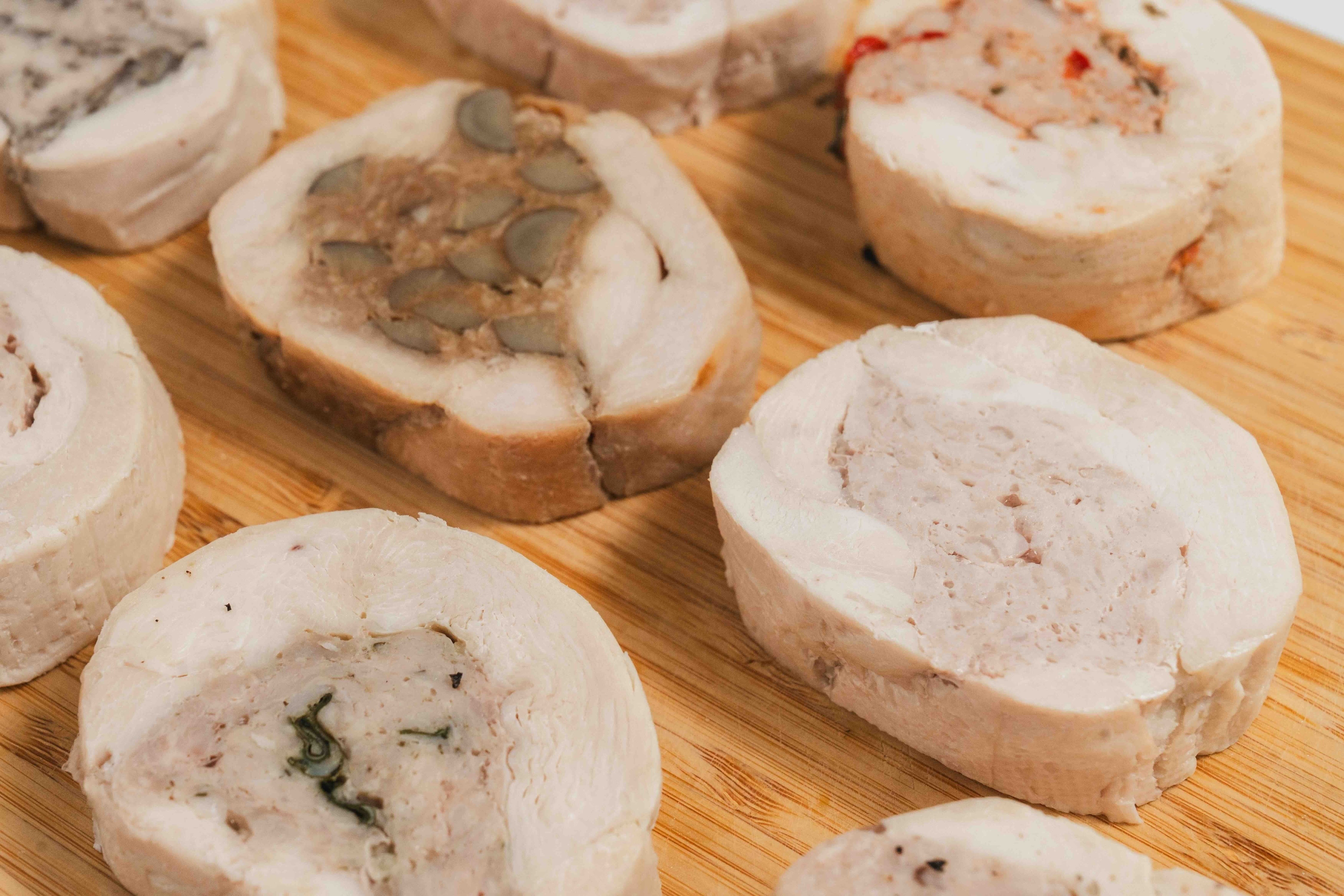 シェフのチキンは、外側と内側の肉の色が違います。これは何かというと、「外側に鶏むね、内側に鶏もも」を使用しております。