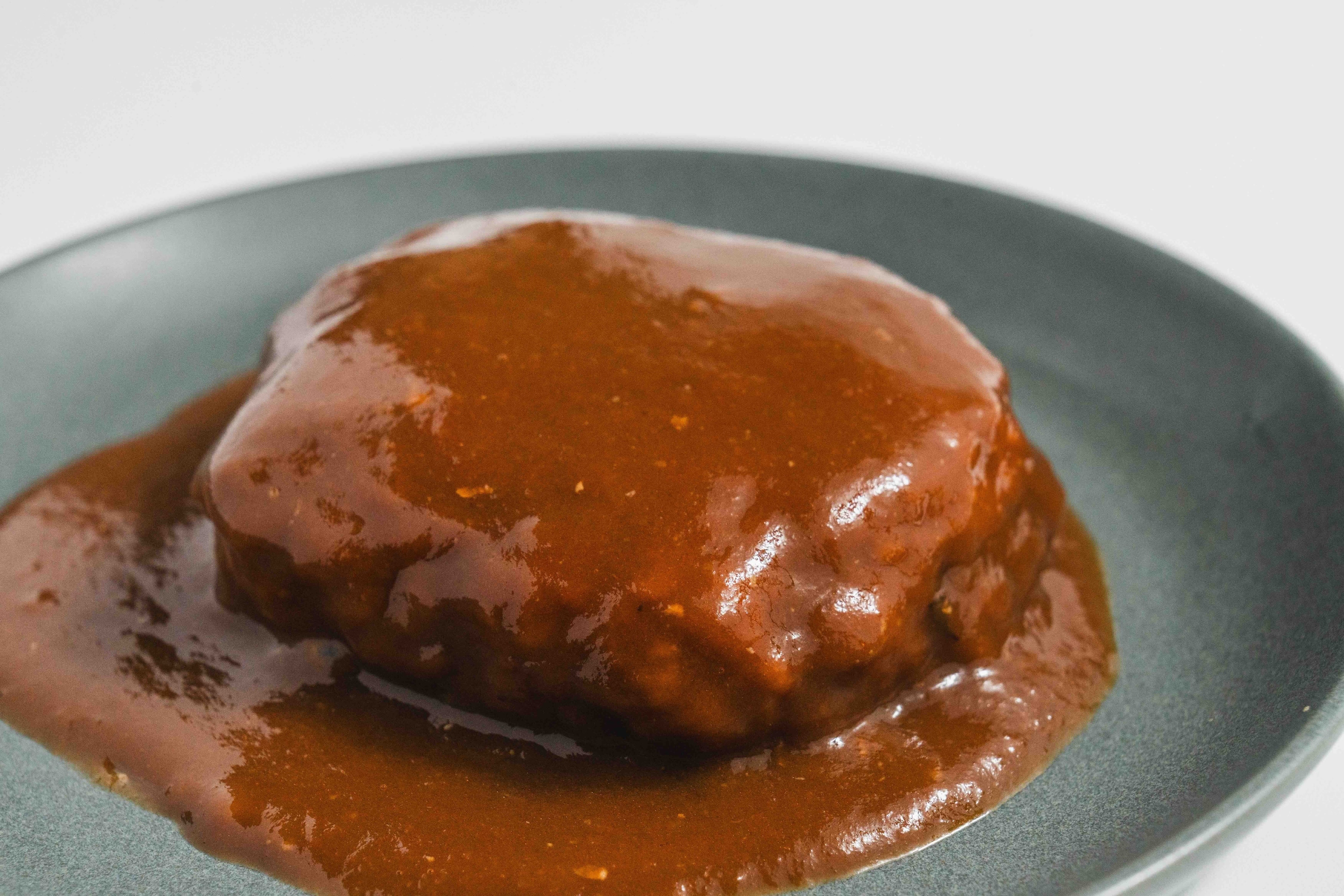 デミグラス缶、トマト、玉ねぎ、にんじん、セロリ、赤ワイン、醤油、食塩、砂糖、バルサミコ酢、食用菜種油
