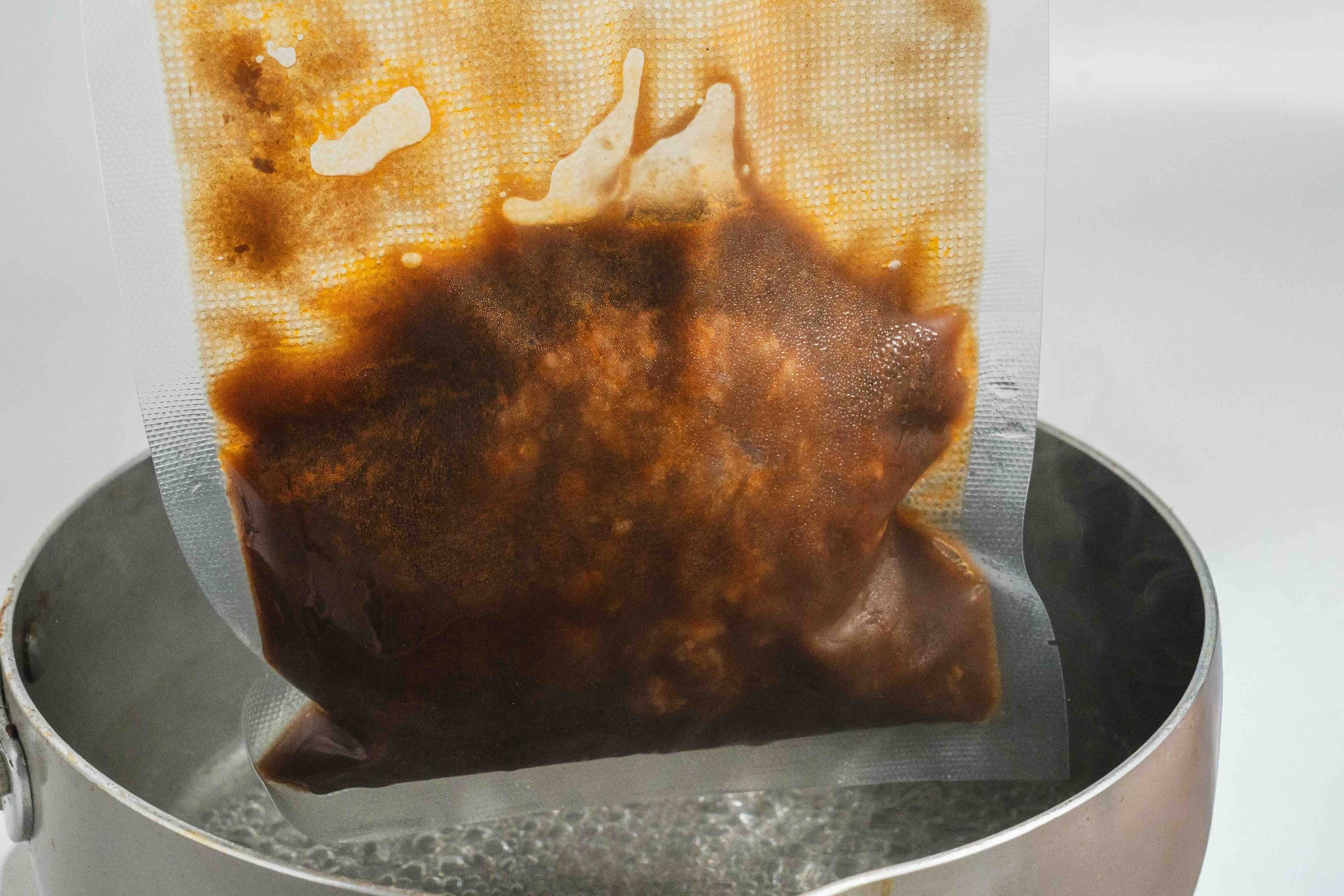 3、シェフのデミグラスハンバーグを冷凍のまま、袋のままお湯に入れる