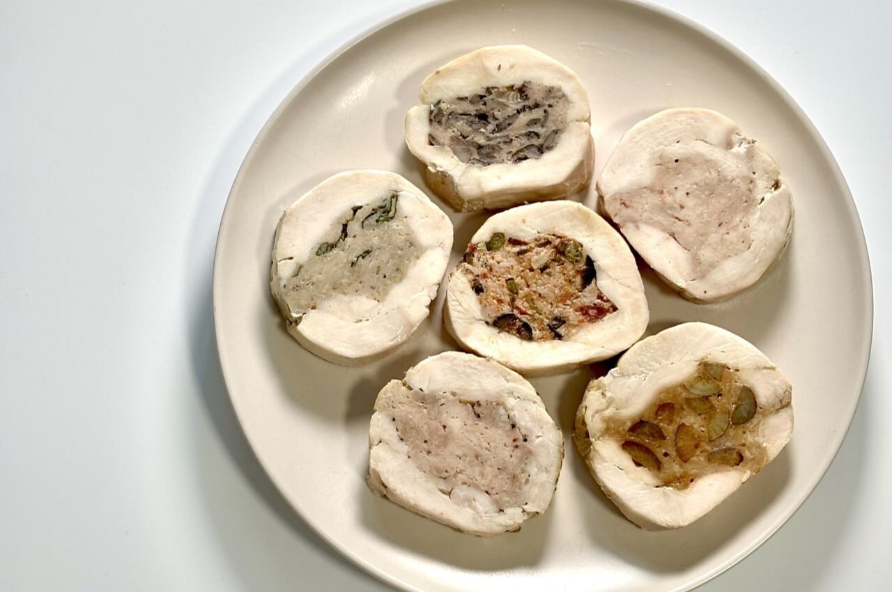 実は「バロティーヌ」というフランス料理の一つなんです。フランス料理では伝統的な料理で、豚肉や鶏肉のひき肉を、鶏肉や鴨肉などで巻き、低温調理で仕上げます。